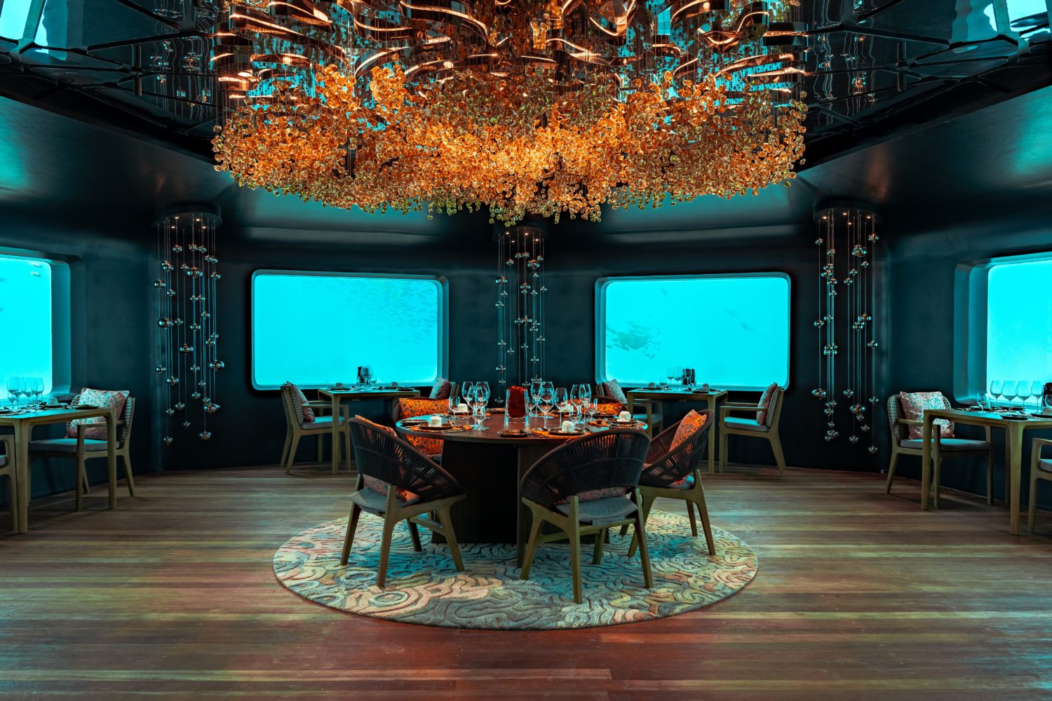 BUBBLE, the underwater restaurant, could easily tip into novelty. It doesn’t. Even viewed ahead of dining, it’s calm and oddly grounding. Fish glide past at eye level. Coral shifts beyond the glass. No theatrics, no forced awe. Just the quiet understanding that you’re beneath the ocean and that this is, apparently, normal now.