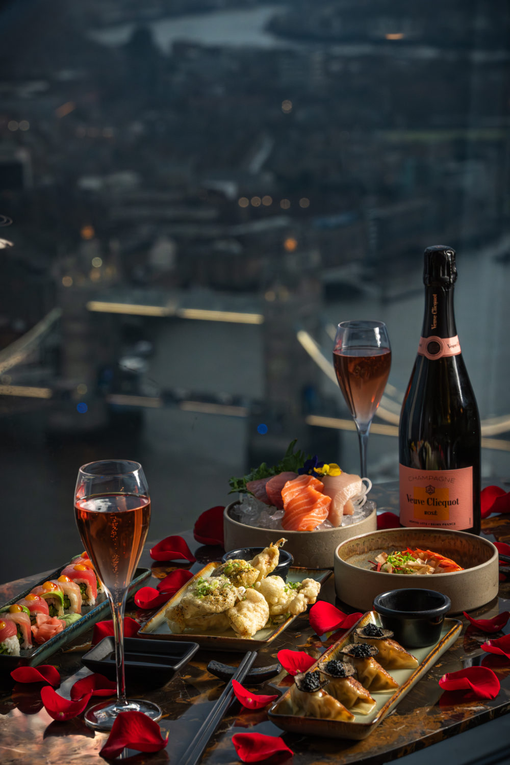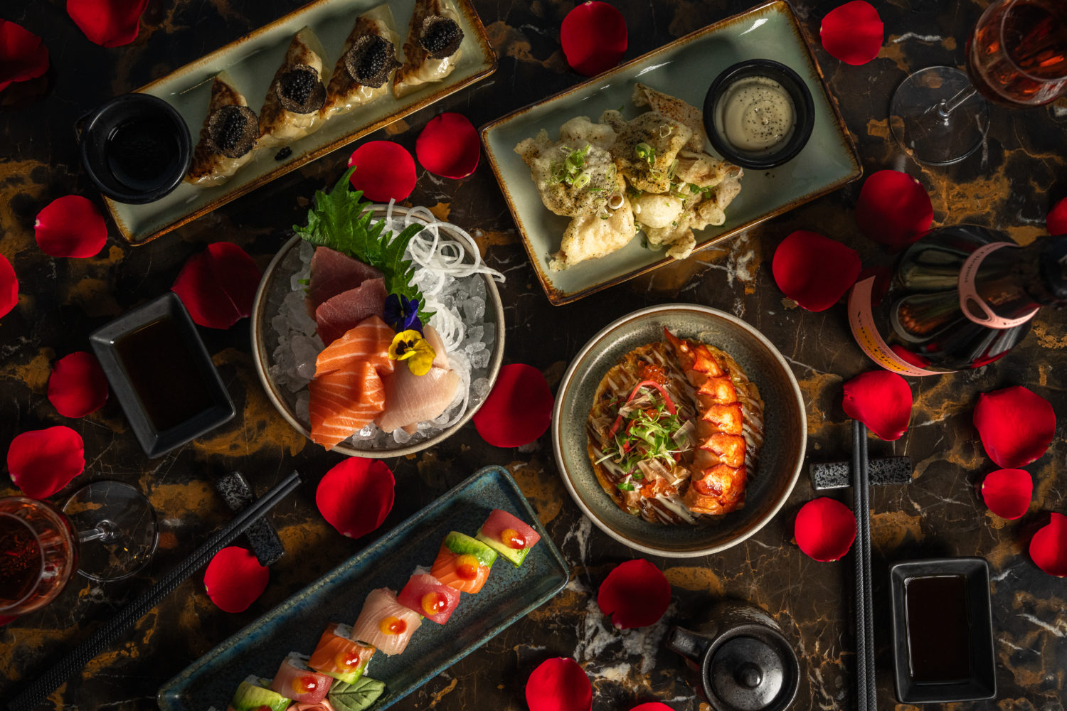 The Valentine’s Sharing Experience for Two, priced at £498, pairs a bottle of Veuve Clicquot Rosé with a decadent selection of dishes. Rainbow maki rolls layered with salmon, hamachi and tuna, Kagoshima wagyu gyoza crowned with Oscietra caviar and black truffle, and lobster okonomiyaki with Japanese barbecue sauce arrive as works of art. Signature cocktails, inspired by nature and the elements, complete an evening that feels cinematic in scale and deeply personal in mood.