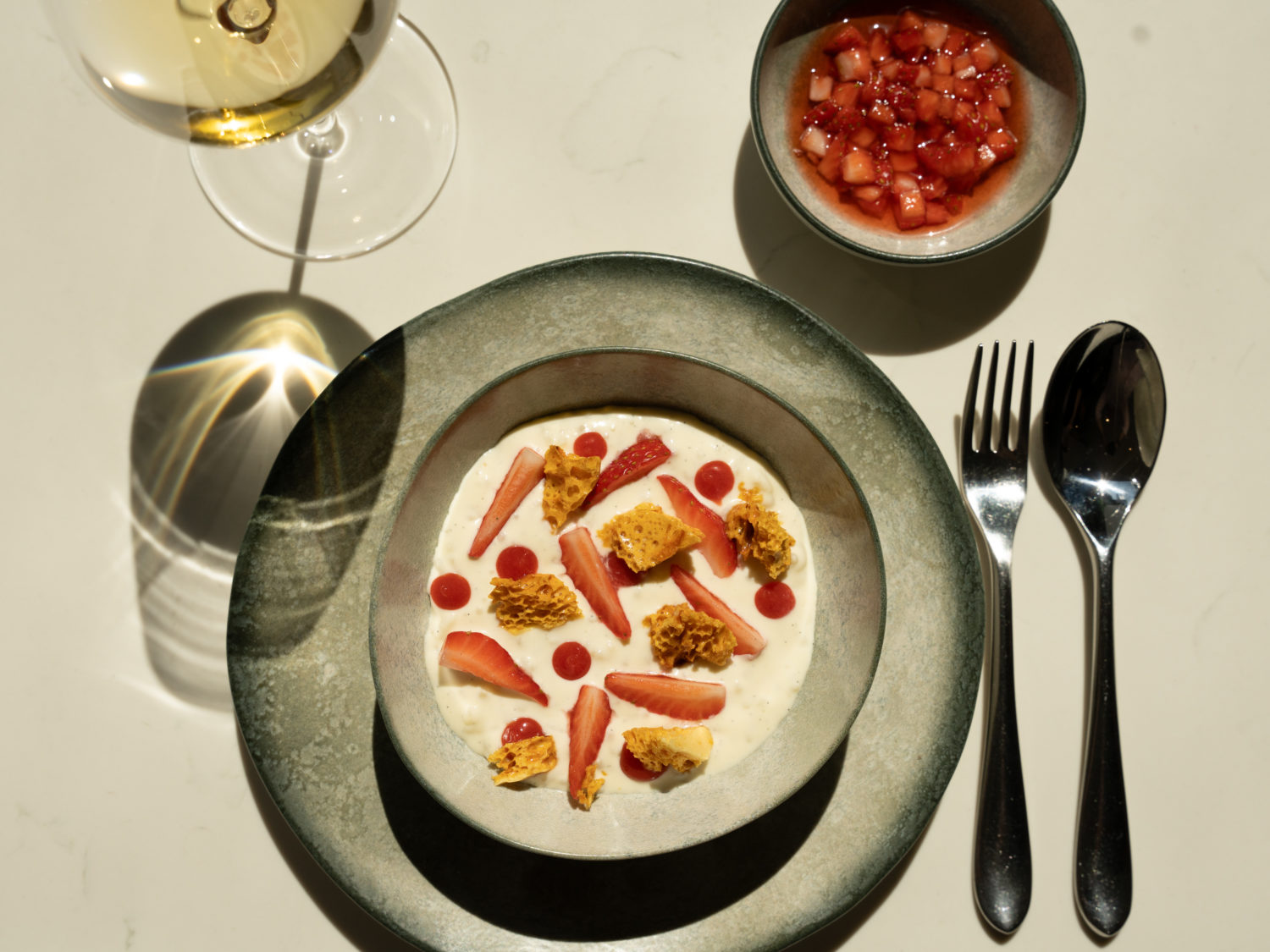 Dessert concludes with Sticky Toffee Braeburn Apple Pudding and clotted cream ice cream, providing a warm and comforting finish suited to its countryside setting.