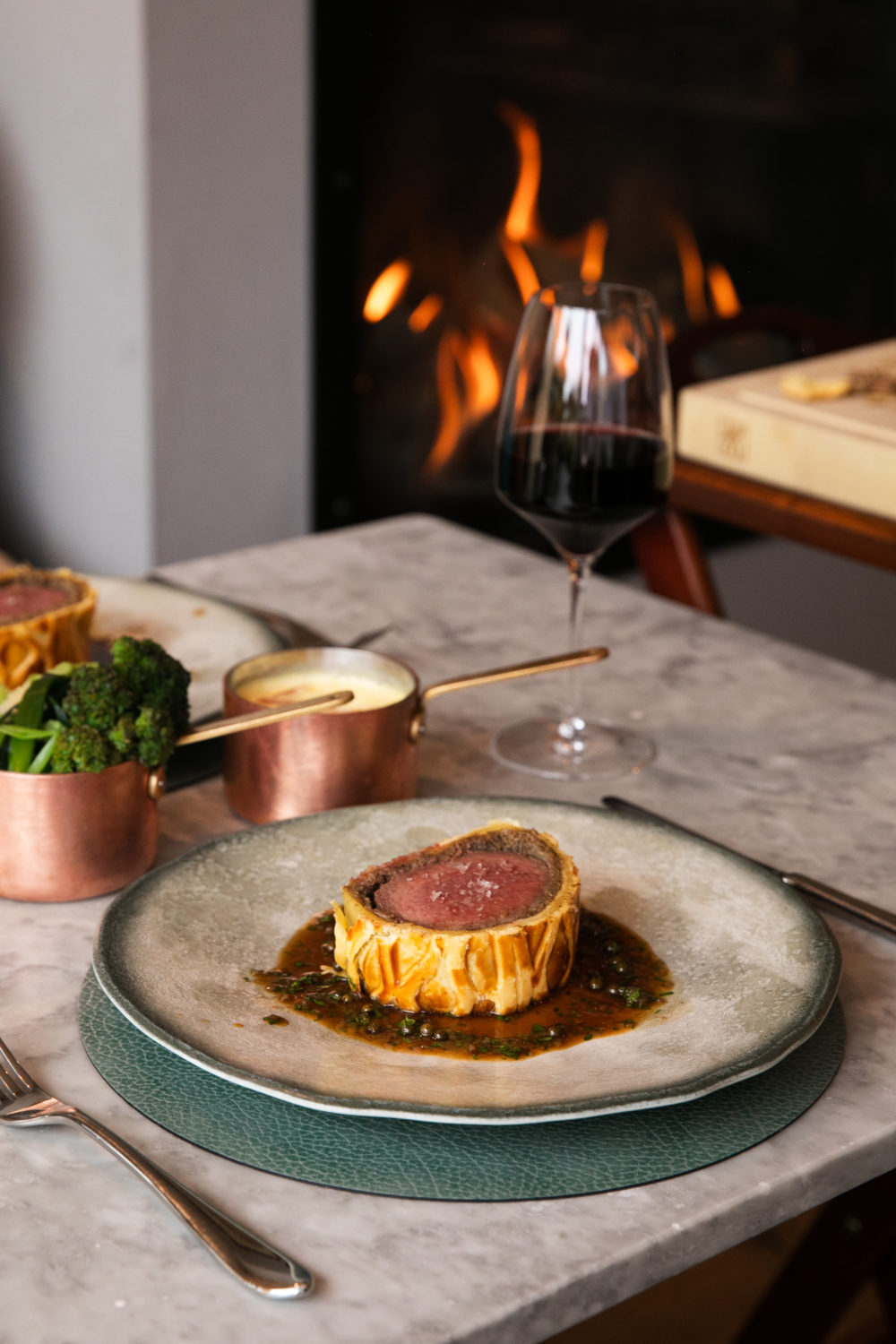 For the main course, the Stokes Marsh Farm Beef Wellington is designed to share, served with Stinking Bishop dauphinoise, peppercorn sauce and garlic mash, presenting a confident and refined take on a British classic.