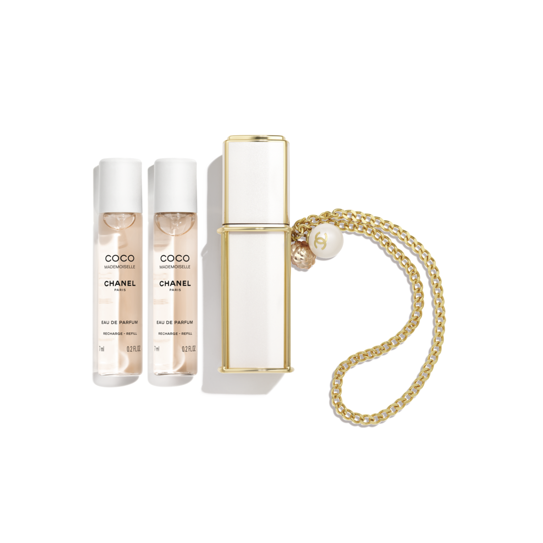 Housed in a white and gold case finished with a chain strap, glass pearl and camellia charm, this is scent you can wear on your wrist or slip into your handbag. Inside, the signature Eau de Parfum remains luminous – sparkling orange opening into jasmine and rose, grounded by patchouli and vetiver.