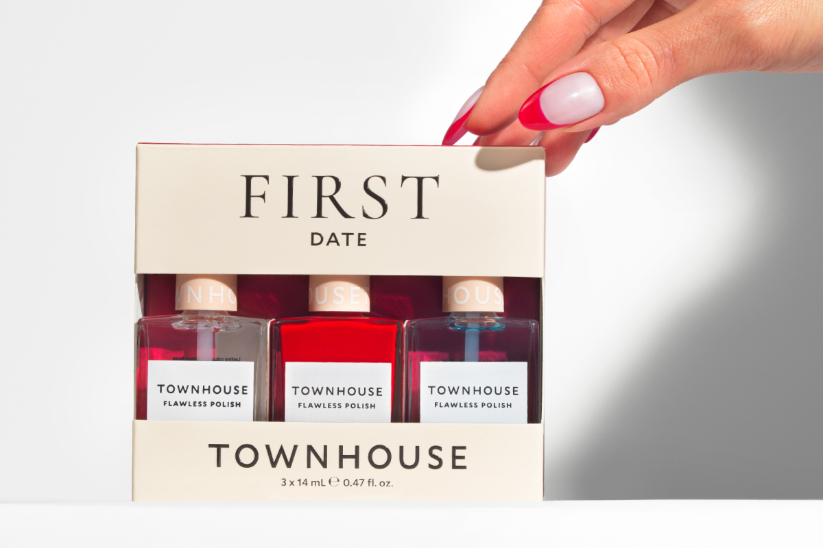 An elevated at-home manicure set featuring a soft strawberry-toned polish, base coat and top coat for a high-gloss finish. Polished, unfussy and quietly confidence-boosting.